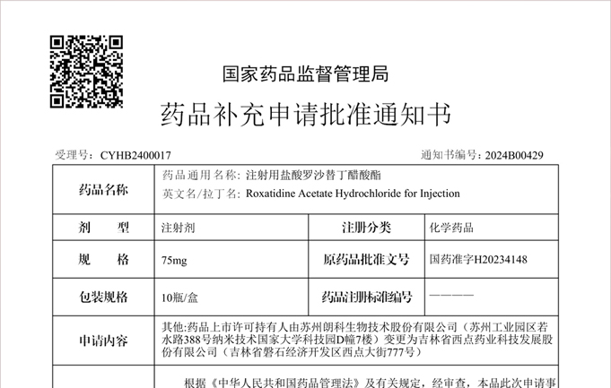 公司近日收到國家藥品監(jiān)督管理局簽發(fā)的注射用鹽酸羅沙替丁醋酸酯《藥品補(bǔ)充申請批準(zhǔn)通知書》,同意按照《藥品上市后變更管理辦法(試行)》相關(guān)規(guī)定,批準(zhǔn)本品上市許可持有人由“蘇州朗科生物技術(shù)股份有限公司”變更為“吉林省西點(diǎn)藥業(yè)科技發(fā)展股份有限公司”,藥品批準(zhǔn)文號不變。